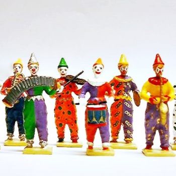 ens. de 2 clowns portant une poutre avec enfant en équilibre