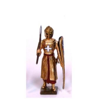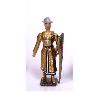 "Figurine de collection au 1/35e, en alliage de plomb et d'étain, peinte à la main, représentant un croisé, cotte dorée, casque plat, avec lance et bouclier ""croix""" -
