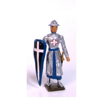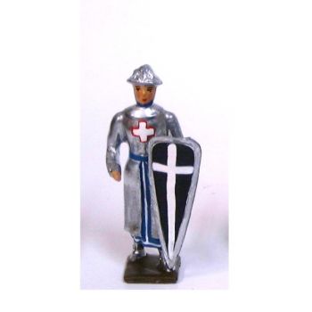 "Figurine de collection au 1/35e, en alliage de plomb et d'étain, peinte à la main, représentant un croisé, cotte argentée, casque plat, avec bouclier ""croix"" au bras gauche" -