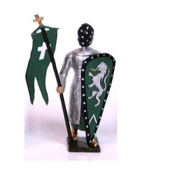 "Figurine de collection au 1/35e, en alliage de plomb et d'étain, peinte à la main, représentant un croisé, cotte argentée, heaume, avec drapeau vert et bouclier vert ""lion""" -