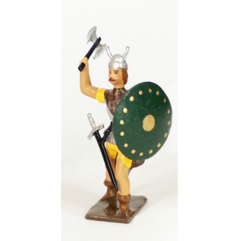 Figurine de collection au 1/35e, en alliage de plomb et d'étain, peinte à la main, représentant un gaulois, casque à cornes, avec hache en l'air et bouclier