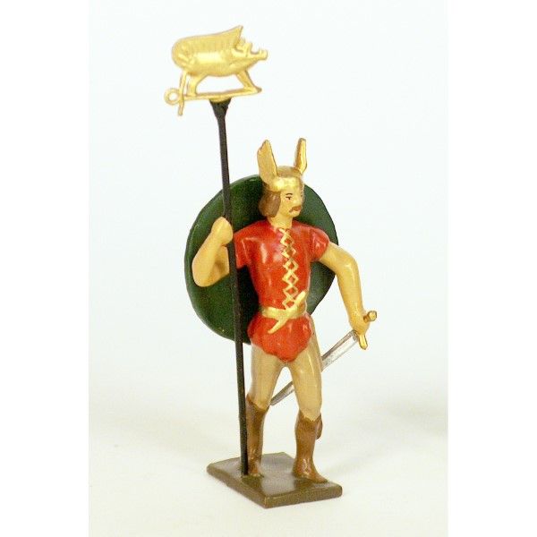 gaulois casque ailé, tenue rouge, avec emblème et bouclier dans le dos