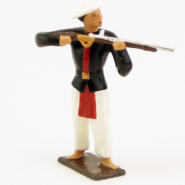 Tirailleur Annamite, haut noir, bas blanc, fusil en joue