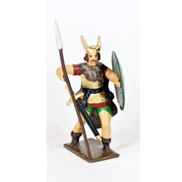 Figurine de collection au 1/35e, en alliage de plomb et d'étain, peinte à la main, représentant un gaulois, casque ailé, avec lance et bouclier