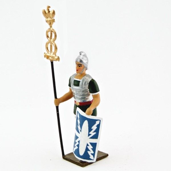 Romain porte-enseigne, uniforme blanc-or-vert-rouge, bouclier "foudres" à fond bleu
