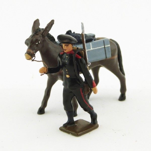 Artilleur de montagne tirant un mulet avec caisses a munitions sur le dos
