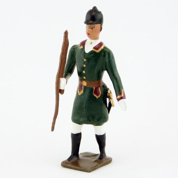 Veneur, manteau vert Russe à parements bordeaux, avec fouet à la main