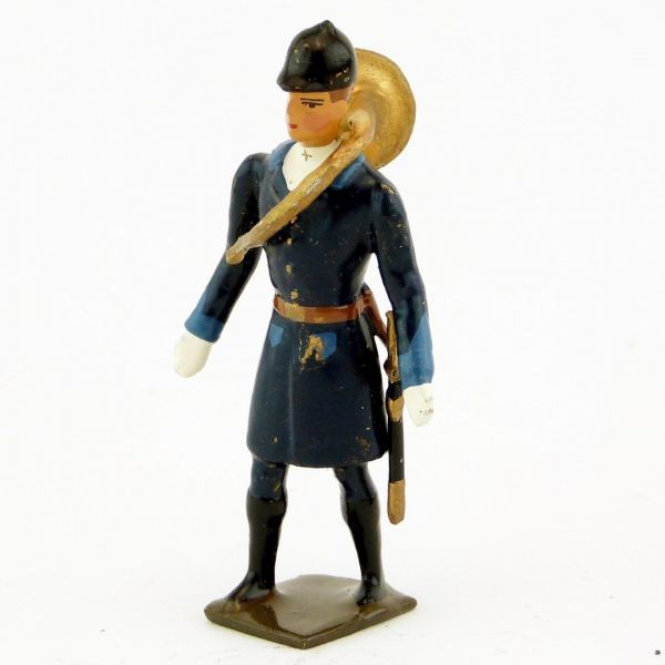 Veneur, manteau bleu Pompiers à parements bleu Gentiane, avec trompe autour du c