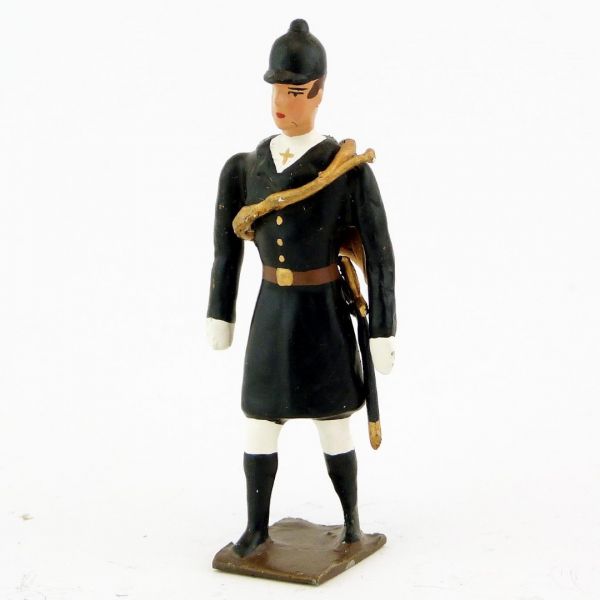 Veneur, manteau noir à parements noir, avec trompe autour du corps