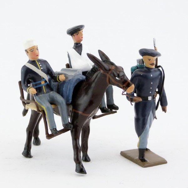 chasseur alpin tenant un mulet avec deux blessés assis sur cacolet