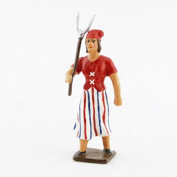 femme révolutionnaire, gilet rouge, fourche sur l'épaule