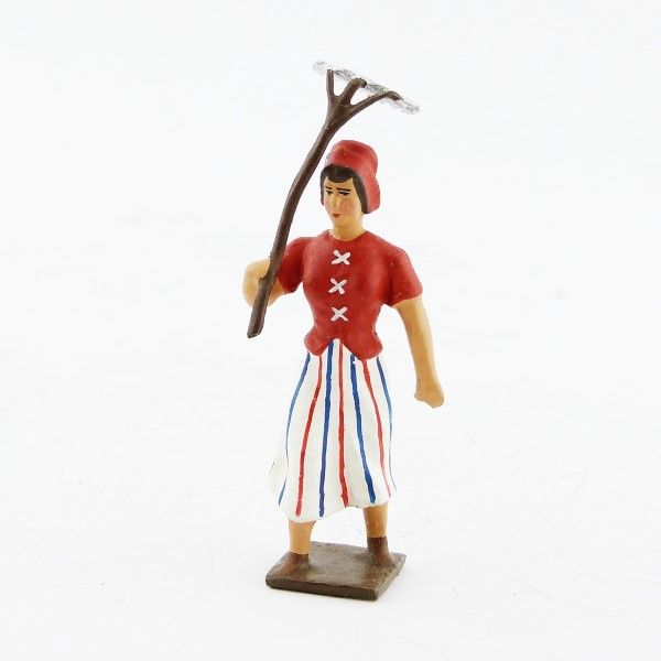 femme révolutionnaire en rouge, râteau sur l'épaule