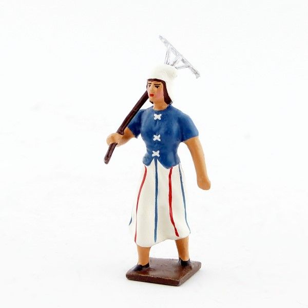 femme révolutionnaire en bleu, râteau sur l'épaule