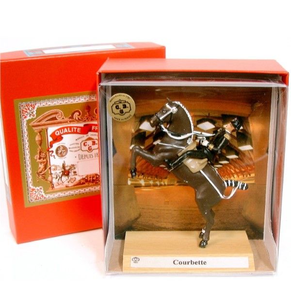 Grand cavalier du Cadre Noir « Courbette » en coffret de luxe (socle bois, fond décoré, rhodoïd, coffret carton rouge)