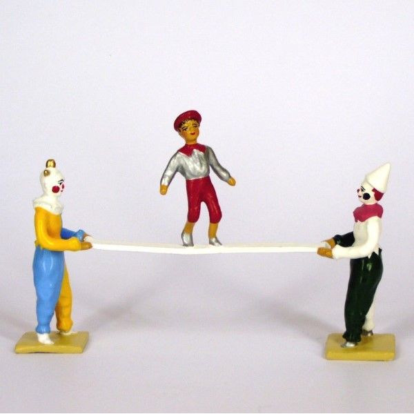 ens. de 2 clowns portant une poutre avec enfant en équilibre