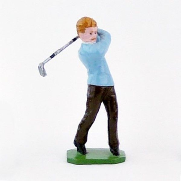 Golfeur, pull bleu ciel, en fin de swing - Golfeurs (S.E.A)