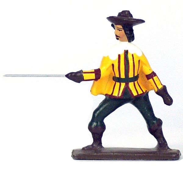 Figurine de collection au 1/35e, en alliage de plomb et d'étain, peinte à la main, représentant un Mousquetaire, tenue jaune et bordeaux, avec cape