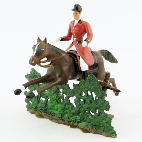 cavalier, redingote rouge, sur cheval marron sautant haie + barrière