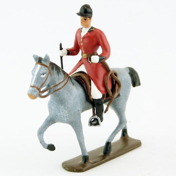 cavalier, redingote rouge, avec cravache (fouet à la ceinture) sur cheval gris au pas