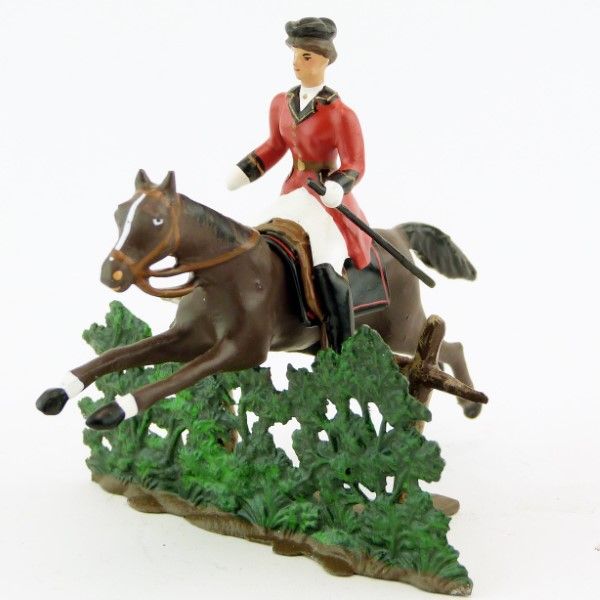 cavalière (cravache) sur cheval marron sautant haie + barrière
