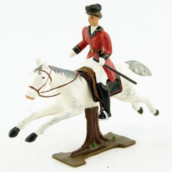 cavalière (cravache), redingote rouge, sur cheval blanc au galop (sur tronc)