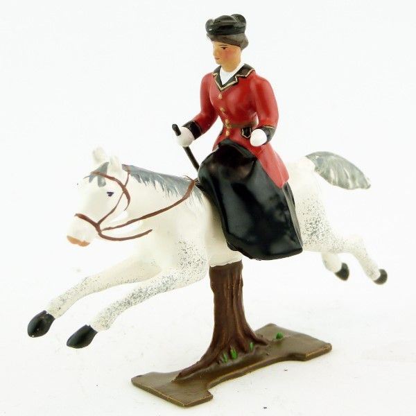 cavalière en amazone sur cheval blanc au galop (sur tronc)