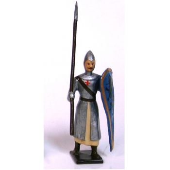"Figurine de collection au 1/35e, en alliage de plomb et d'étain, peinte à la main, représentant un croisé, cotte argentée, casque pointu, avec lance et bouclier ""lion"""