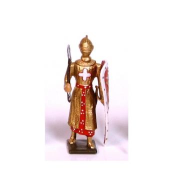 "Figurine de collection au 1/35e, en alliage de plomb et d'étain, peinte à la main, représentant un croisé, cotte dorée, casque fermé, avec hache et bouclier ""lion"""