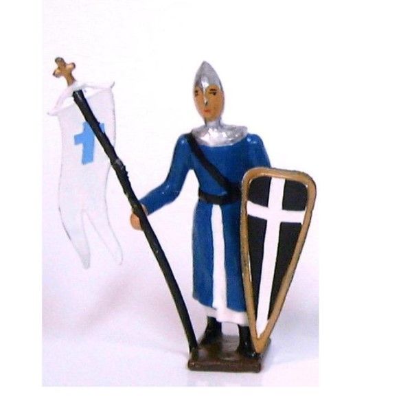"Figurine de collection au 1/35e, en alliage de plomb et d'étain, peinte à la main, représentant un croisé, cotte bleue, casque pointu, avec drapeau et bouclier ""croix"""