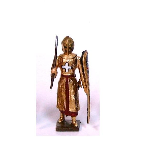 "Figurine de collection au 1/35e, en alliage de plomb et d'étain, peinte à la main, représentant un croisé, cotte dorée, heaume, avec hache et bouclier bleu ""lion"""