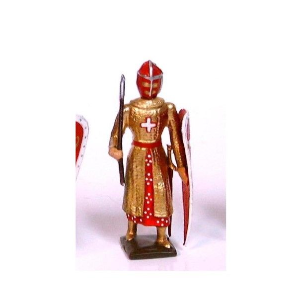 "Figurine de collection au 1/35e, en alliage de plomb et d'étain, peinte à la main, représentant un croisé, cotte dorée, heaume rouge, avec lance et bouclier rouge ""croix"""