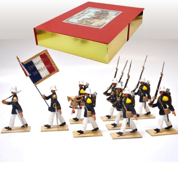 Infanterie de marine, tenue d'hiver, coffret de 9 figurines (1 Officier, 1 Drapeau, 1 Tambour, 1 Trompette, 5 Marsouins)