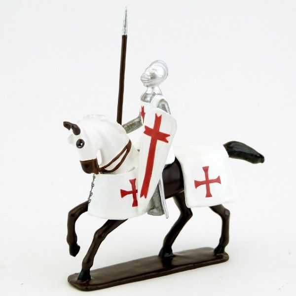 Templier, casque bassinet, lance et bouclier, sur cheval bai (marron)