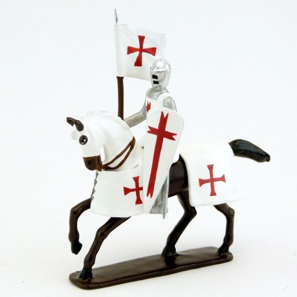 Templier à cheval, grand heaume, porte-banière sur cheval bai (marron)