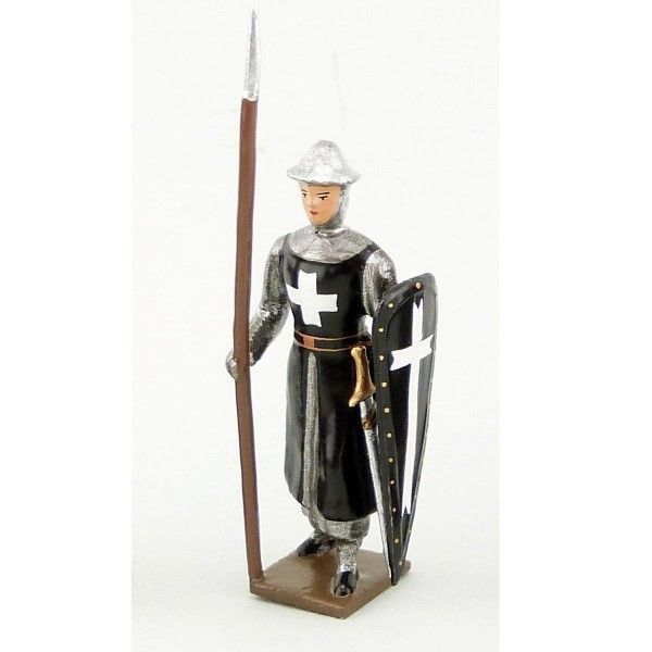 Figurine de collection au 1/35e, en alliage de plomb et d'étain, peinte à la main représentant un Hospitalier (tunique noire), casque plat, lance et bouclier