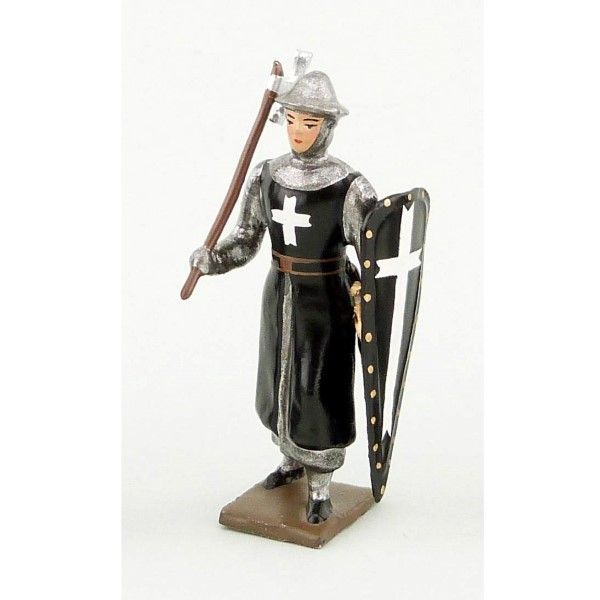 Figurine de collection au 1/35e, en alliage de plomb et d'étain, peinte à la main représentant un Hospitalier (tunique noire), casque plat, hâche et bouclier