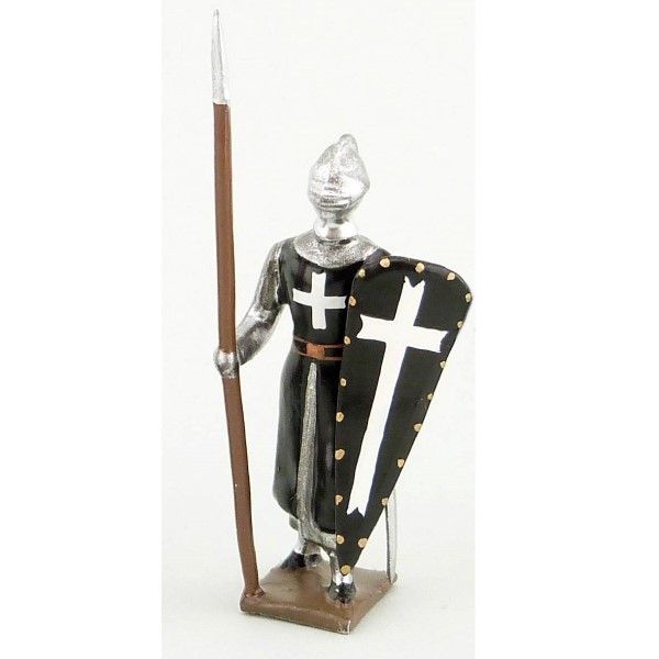 "Figurine de collection au 1/35e, en alliage de plomb et d'étain, peinte à la main représentant un Hospitalier (tunique noire), casque ""bacinet"", lance et bouclier"