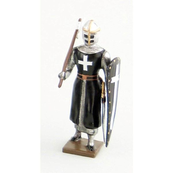 Figurine de collection au 1/35e, en alliage de plomb et d'étain, peinte à la main représentant un Hospitalier (tunique noire), grand heaume, hâche et bouc lier