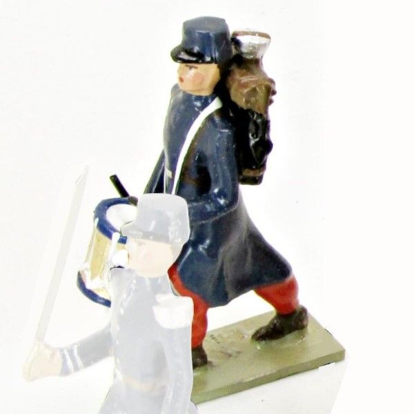 Tambour de l'Infanterie 1870 en capote bleue et pantalon garance, képi drapé bleu